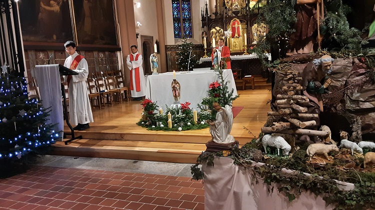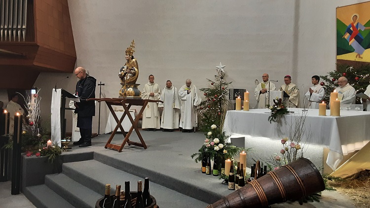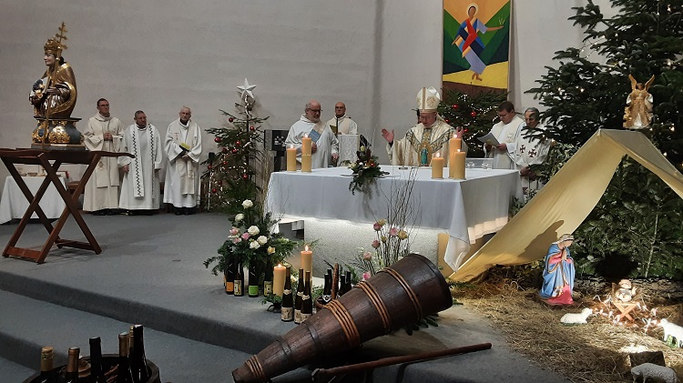 Pour la 1ère fois en 6 ans nous sommes partis le lendemain de Noël, pour le pèlerinage des vignerons. Parti très tôt le matin du 26 pour arriver à l’office qui était présidé par Monseigneur Gilles Reithinger, évêque auxiliaire de Strasbourg, où nous avons pu découvrir les vignerons apportés leurs bouteilles de la récolte 2022 pour la bénédiction. Ils avaient revêtu leurs tabliers de vignerons, la hotte de récolte sur le dos, le saint patron porté à l’épaule et leur charrette de travail. Très belle office chargé d’émotion avec des beaux chants de Noël. Après cette office dégustation des repas festifs, suivie par la musique avec des instruments différents; dont le diacre Antoine NGO THAI HIEP et Mr le Doyen Thomas KANIA on mit leurs voix à contribution pour chanter Noël dans leurs langues respectives. Nous avons eu la chance d’avoir un concert de Noël, ce petit séjour était dans une ambiance festive et détendue; Le jour du retour nous nous nous sommes arrêtés à OBERNAI à un marché de Noël.