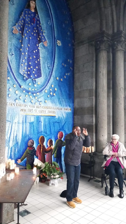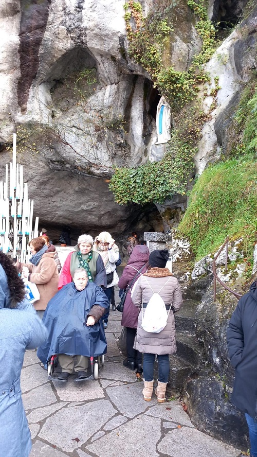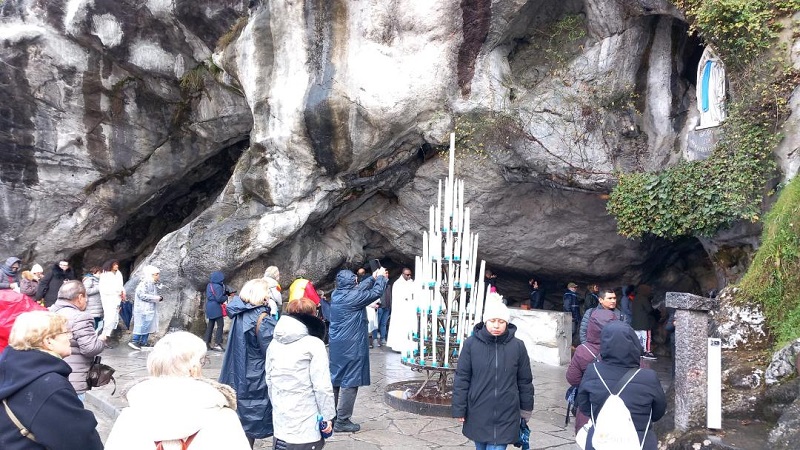 A 15 heures 30 : toujours sous la pluie : récitation du chapelet, c’est aussi l’occasion de déposer nos intentions de prières et de toucher les parois de pierre de la grotte qui ont accueilli Marie et Bernadette.