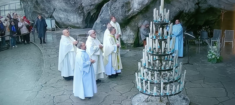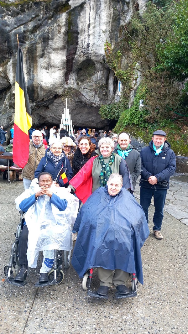 Samedi 10 février, Après notre petit déjeuner, notre journée de pèlerins débute par une messe à la grotte à 10 h. C’est sous la pluie battante que nous nous rassemblons devant la statue de la Sainte-Vierge. La messe est présidée par le Père Hervé Rême, chapelain à Lourdes et concélébrée avec notre doyen Thomas et d’autres prêtres ; un couple fête ses 60 ans de mariage et nous rendons grâce à Dieu pour la fidélité à l’alliance de Dieu avec les hommes et l’humanité.