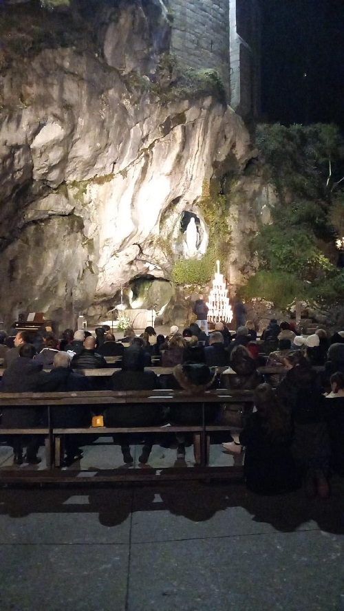 A 20 heures 30 : Pour clôturer cette grande journée de prières, pour les malades et aux intentions qui nous ont été confiées, nous finissons par la procession aux flambeaux ; les participants sont toujours aussi nombreux et la ferveur dans la prière ne faiblit pas.