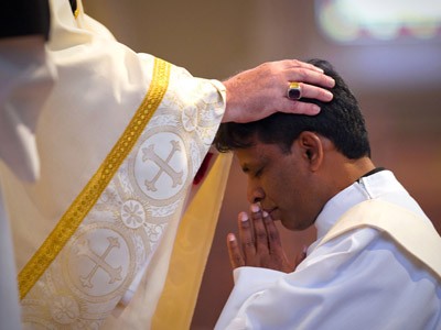 Leur mission dans l´Église leur est confiée, au nom de Jésus Christ, par le sacrement de l´ordre, généralement appelé « ordination ». Le sacrement de l´ordre se caractérise par l´imposition des mains et la prière de consécration prévue. Le sacrement est conféré une fois pour toutes.