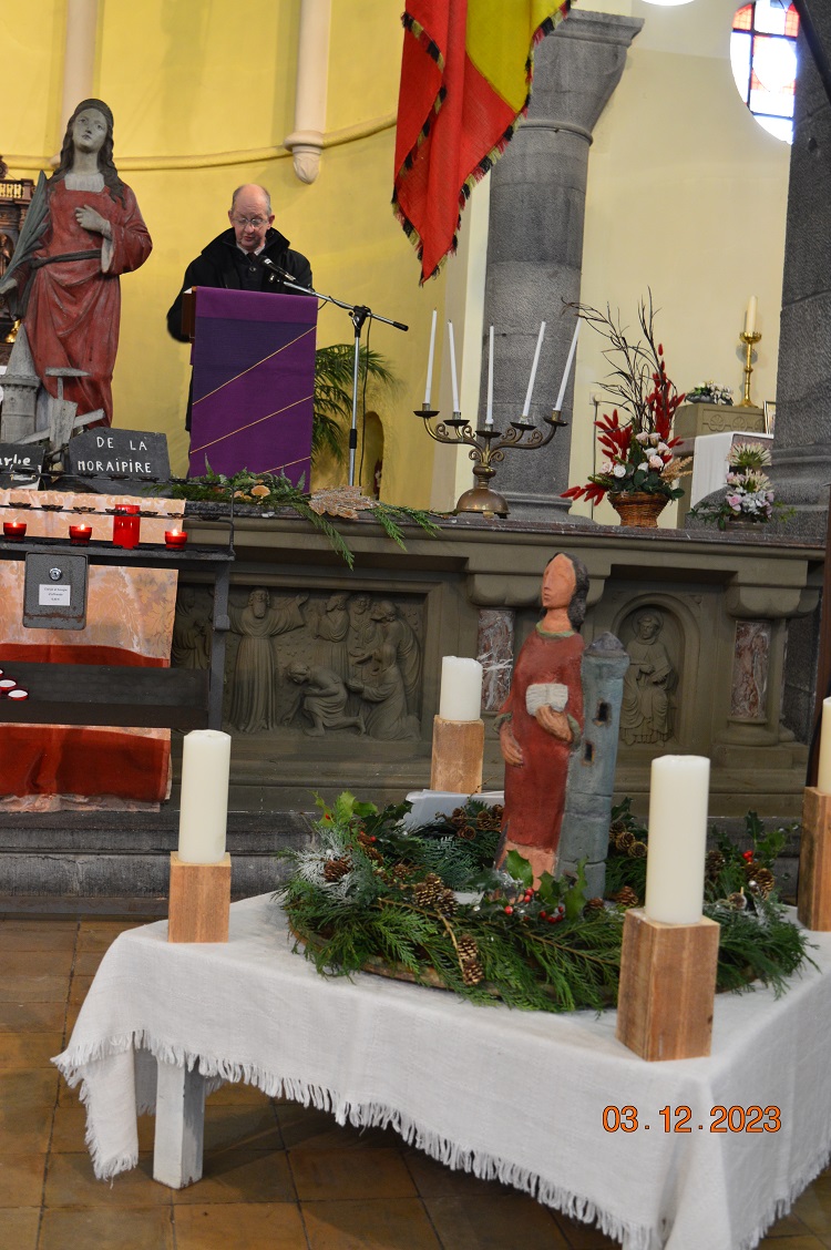 Après l’Evangile lu par l’abbé Antoine-Marie NGO THAI HIEP, vicaire de l’UPNDWSR, l’abbé Clément Tinant, dans son homélie, nous a présenté cette merveilleuse jeune fille qu’était Barbe. Son obstination, sa fierté d’être chrétienne et de ne céder en rien, ni devant les promesses, ni devant les menaces, ni sous les sévices. Il nous invite à suivre l’exemple de Ste Barbe : gardons la fierté de ce que nous sommes, la fierté de ce qui est en nous chrétiens et osons la transmettre. Moment très fort aussi, l’abbé Jean-Marie Poncin a béni la statue de Ste Barbe qu’il a réalisée. Elle accueillera maintenant les visiteurs de la galerie souterraine de la Morépire.