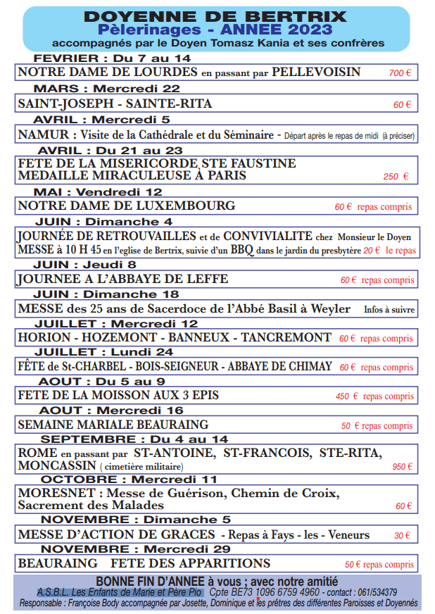 Depuis quelques années, l’ASBL LES ENFANTS DE MARIE ET PERE PIO s’occupe de l’organisation de pèlerinages pour nos fidèles.